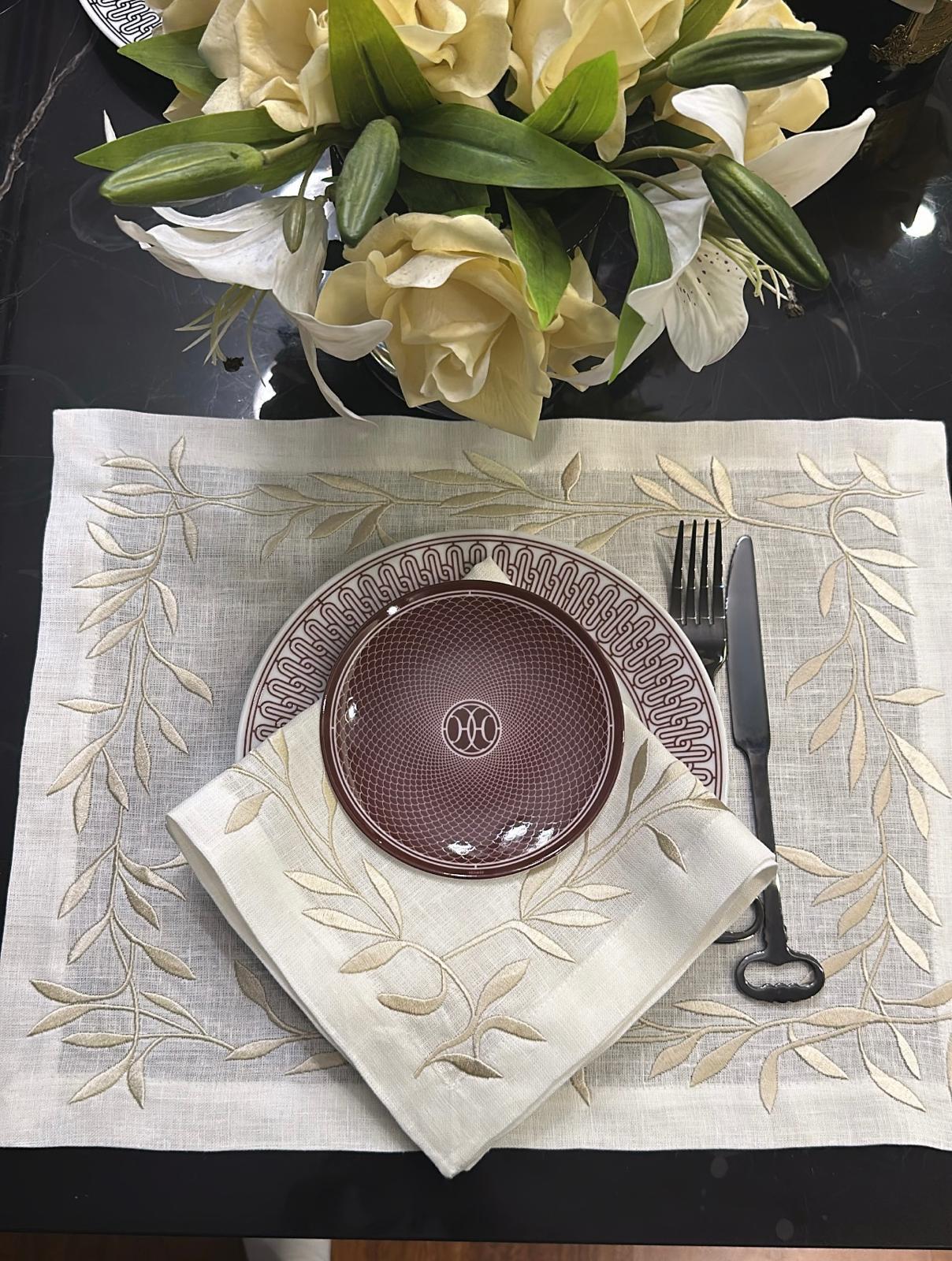 Mirai Şampanya Embroidered Leaves Amerikan Servis & Servis Peçetesi